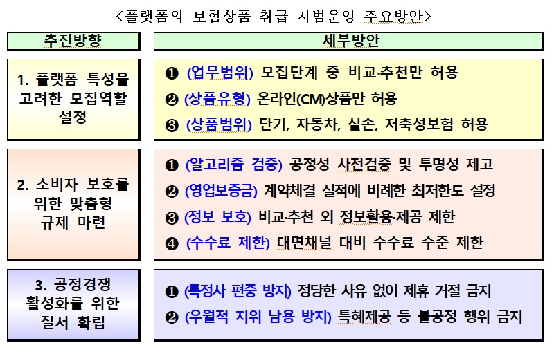 이는 지난해 8월 23일 제2차 금융규제혁신회의 이후 발표한 ‘플랫폼의 보험상품 취급 시범운영방안’의 후속 조치로 이해관계자 의견수렴, 제7차 금융규제혁신회의를 거쳐 내용을 확정했다.