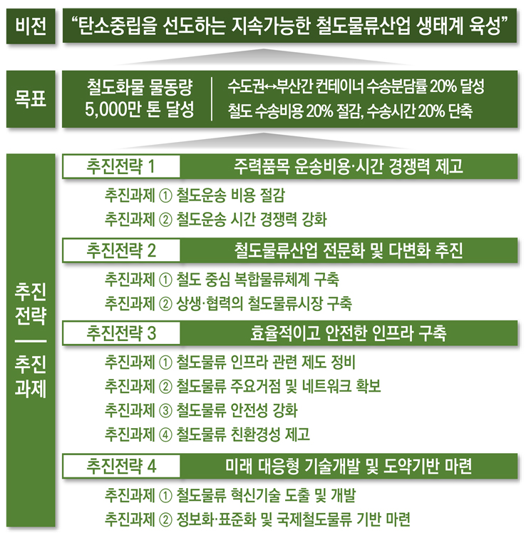 육성계획에서는 ‘탄소중립을 선도하는 지속가능한 철도물류산업 생태계 육성’을 비전으로 2026년까지 철도화물 수송량 5000만톤을 달성할 수 있도록 분야별 4대 추진전략과 10개 추진과제를 제시하고 있다.