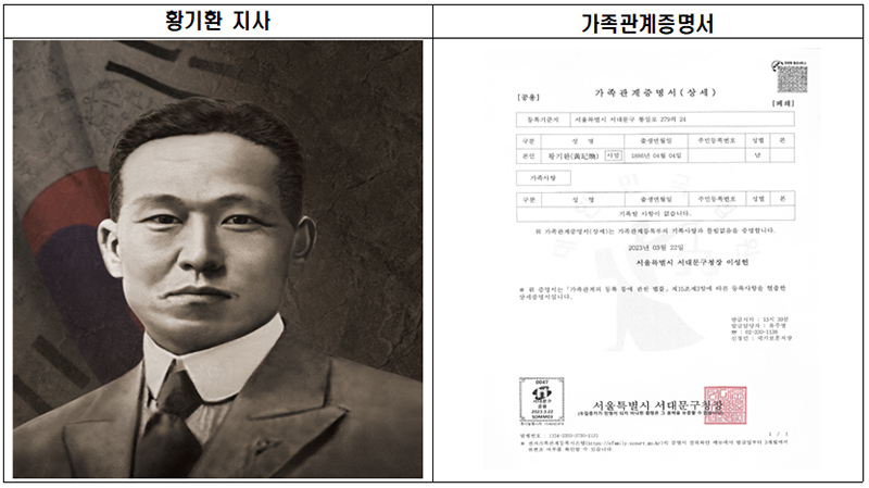 황기환 지사는 일제강점기 조선인에게 적용됐던 민사에 관한 사항을 규정한 법률인 조선민사령 제정(1912년) 이전 독립운동을 위해 국외로 이주함으로써 대한민국의 공적서류상 적을 한번도 갖지 못했으나 이번 가족관계 등록 창설로 완전한 대한국인이 됐다.