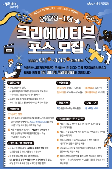 서울시와 서울경제진흥원(SBA)은 1인 미디어 창작자 지원 사업인 ‘크리에이티브포스’를 연말까지 1,000팀(누적)을 운영하겠다고 밝혔다.