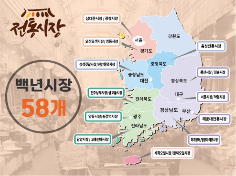 백년시장은 개설 이후 100년 이상 영업 중인 전통시장을 일컫는 말로 수도권 5곳, 지방 53곳 등 전국에 58곳이 있다.