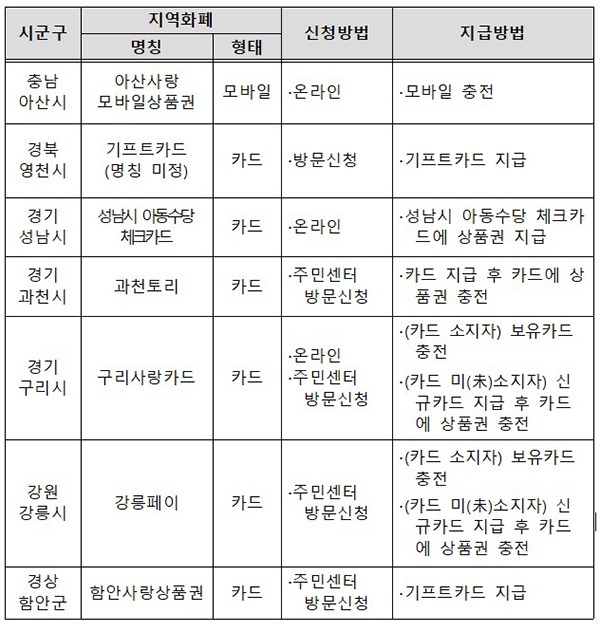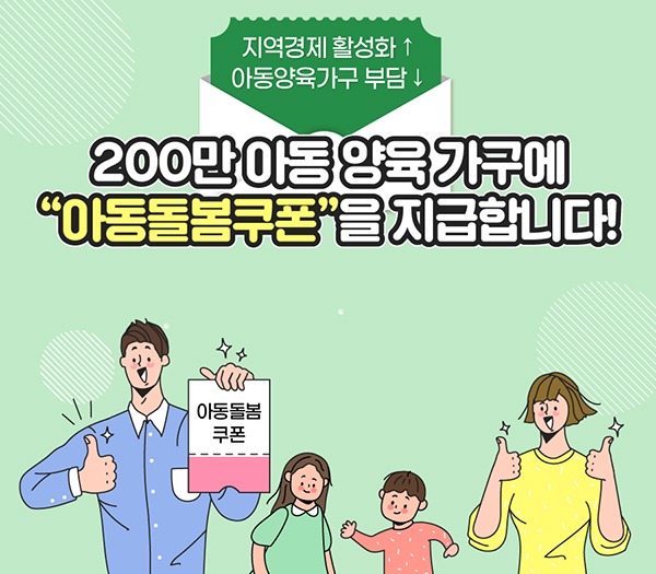아동돌봄쿠폰은 지난 3월 아동수당을 지급 받은 만 7세 미만 아동이 있는 약 209만 가구에 아동 1인당 40만원을 지원하는데, 다만 지급 방식은 지방자치단체별로 다르다.