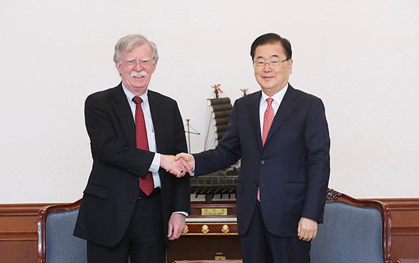 정의용 청와대 국가안보실장과 존 볼튼 미국 백악관 국가안보보좌관은 24일 청와대에서 만나 최근 일어난 중·러 군용기의 한국방공식별구역(KADIZ) 침입 등 한반도 문제에 대해 긴밀하게 협의하기로 했다.