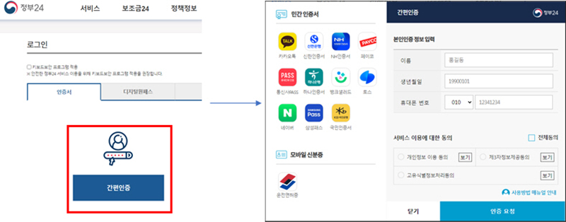 간편인증이란 국민이 자주 사용하는 민간인증서를 선택해 공공서비스를 이용하는 인증방식으로 카카오, 네이버, 통신사PASS, 토스, 하나은행 등이 있다.