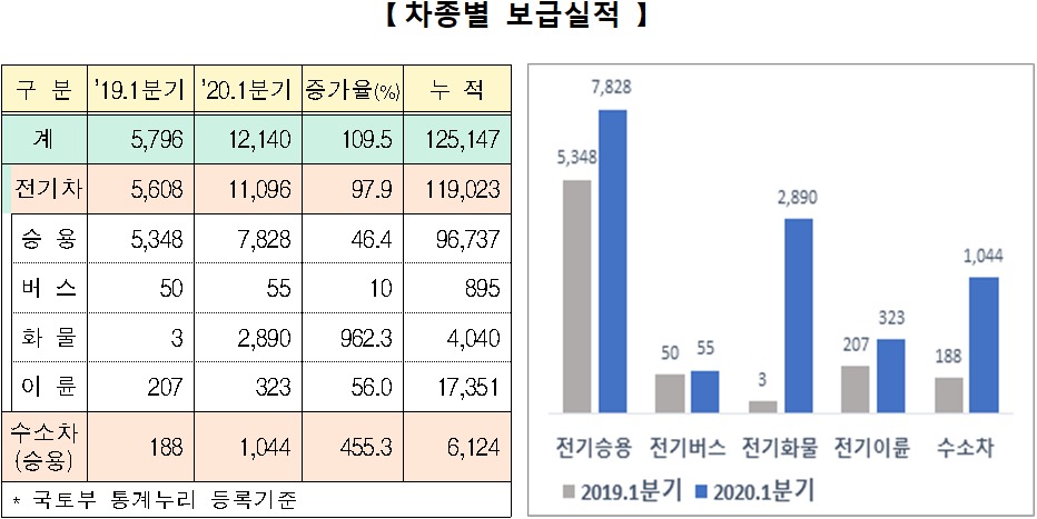 환경부는 2020년도 1분기 미래차(전기·수소차) 보급사업 추진 실적을 분석한 결과, 이 기간 동안 미래차 1만 2,140대가 보급되어 지난해 같은 기간보다 110% 증가했다고 밝혔다.