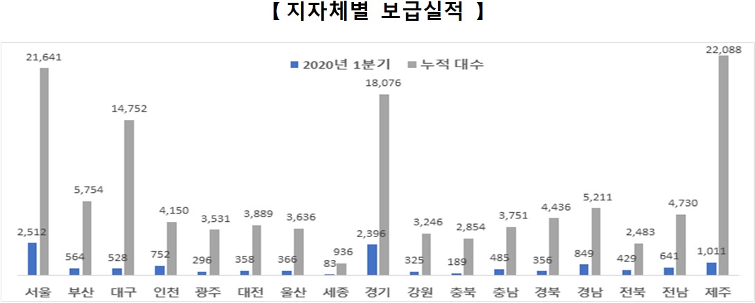 지자체별 2020년도 1분기 미래차 보급실적은 서울시가 1위(2,512대), 경기도가 2위(2,396), 제주도가 3위(1,011대)를 기록했다.