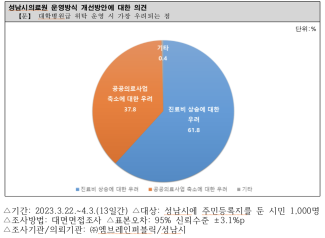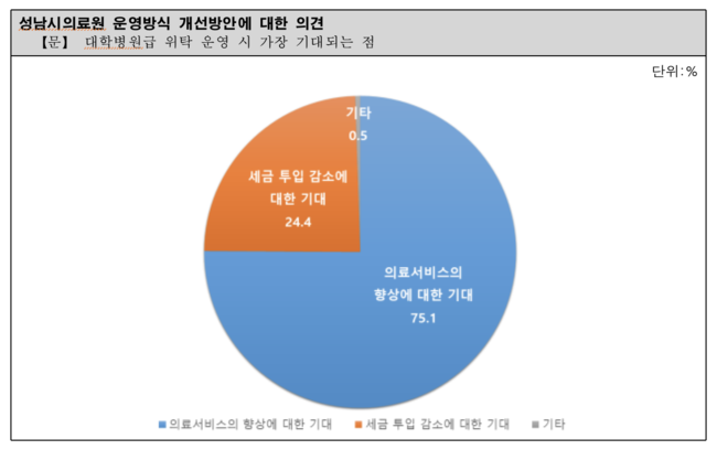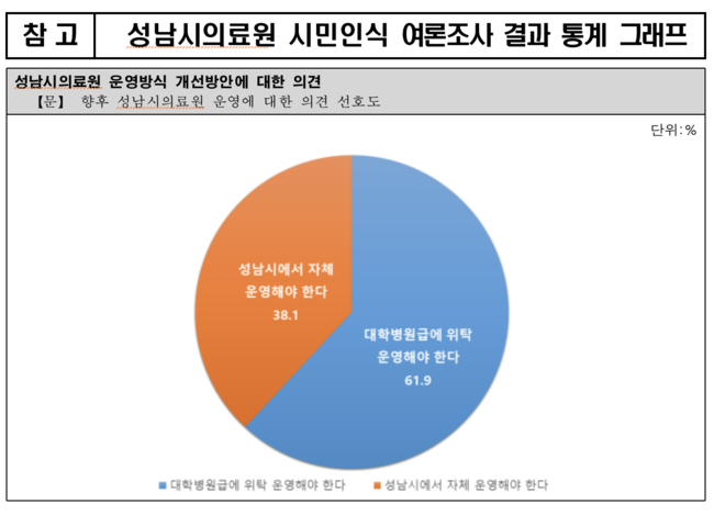 설문 조과 결과 응답자 1000명 중 619명(61.9%)이 성남시의료원 운영방식 개선방안을 묻는 설문에 ‘대학병원급에 위탁 운영해야 한다’고 답했다.