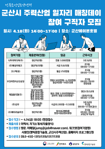 군산 전북조선업도약센터는 관내 구직자들에게 다양한 취업 기회를 제공하고 구인-구직 미스매치 해소로 침체한 고용시장에 활력을 불어넣기 위해 오는 18일 오후 2시부터 5시까지 군산에이본호텔 컨벤션홀에서 '군산 주력산업 일자리 매칭데이'를 개최한다고 밝혔다.