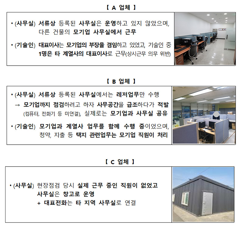 또한 81곳의 의심업체들에 대해 청약 참가자격 미달 여부 확인을 위해 건설산업기본법상 건설업자 등록기준 또는 주택법상 주택건설사업자 등록기준 충족 여부를 중점적으로 점검한 바 있다.
