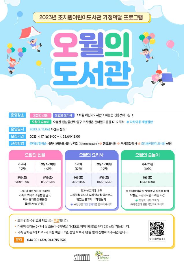 세종특별자치시가 조치원 어린이도서관의 가정의 달 프로그램으로 오는 17일부터 ‘오월의 도서관’ 수강생을 모집한다.