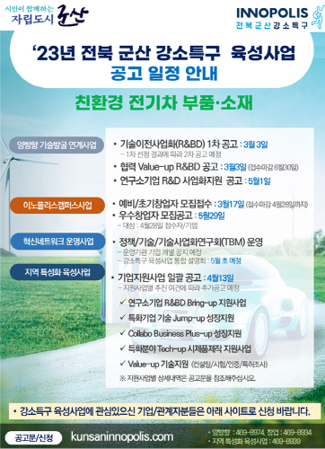 군산 강소특구 육성사업비는 2023년도 총 38억5천만 원으로, 군산 강소특구의 친환경 전기차 부품소재 산업 특화분야 육성을 위해 창업에서 기술이전, 기술사업화 등 미래시장을 선도할 기술력 있는 기업육성을 위한 전주기 맞춤형 지원을 추진한다.