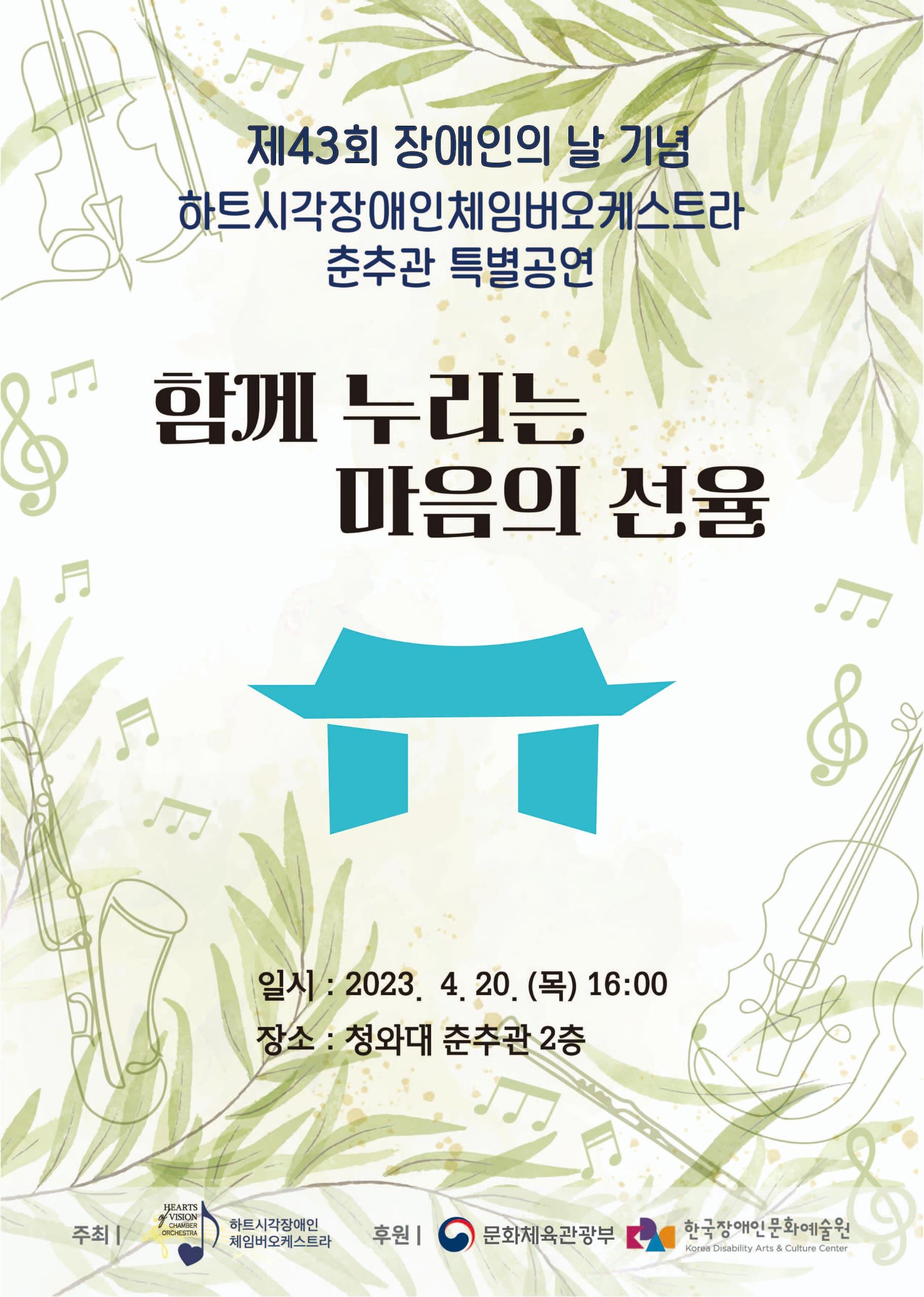 문화체육관광부는 하트시각장애인체임버오케스트라, 한국장애인문화예술원과 함께 20일 오후 오후 4시 춘추관에서 특별공연 ‘함께 누리는 마음의 선율’을 개최한다고 12일 밝혔다.