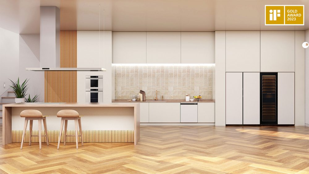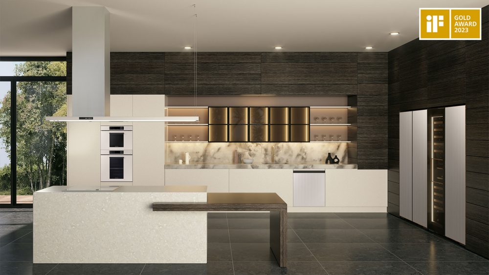 금상을 수상한 ‘ 비스포크 인피니트 라인 ’ 은 냉장고·와인셀러·오븐· 후드로 구성된 주방 가전 조합으로 , 알루미늄·스테인리스·세라믹 등의 차별화된 소재를 적용해 프리미엄 라이프스타일 감성의 일체감 있는 디자인을 제공했다 .
