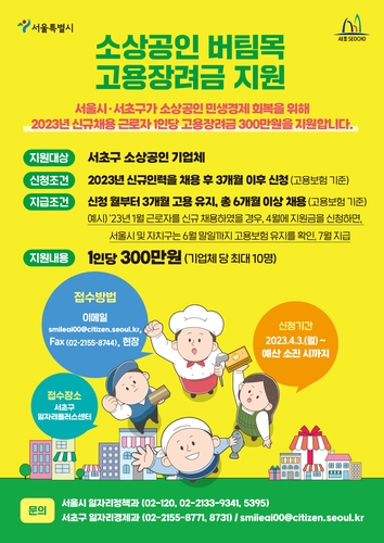 서울 서초구는 최근 경기침체로 인한 경영악화로 인해 인건비 부담으로 인한 소상공인의 신규 채용이 축소되는 것을 예방하기 위해 '소상공인 버팀목 고용장려금'과 '무급휴직 근로자 고용유지지원금'을 지원한다.