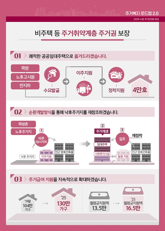 이주희망 수요를 감안하여, 쪽방·노후고시원 우선지원 공공임대 물량을 연 2천호 수준에서 ‘20년에는 5.5천호까지 확대하는 등 ’25년까지 총 4만 가구를 지원한다.
