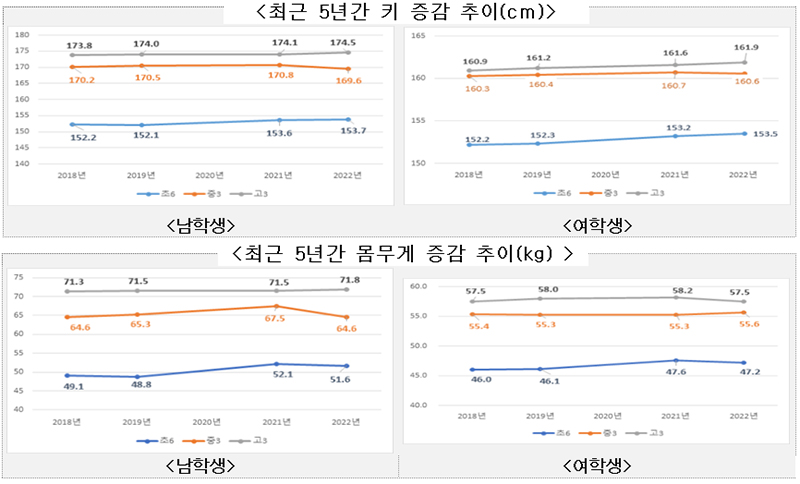 지난해 학생들의 성장 수준을 확인하기 위해 초등학교 1학년부터 고등학교 3학년 학생을 대상으로 실시한 신체발달을 살펴보면, 키는 전년 대비 초등학교 6학년과 고등학교 3학년 모두 소폭 커졌으나 중학교 3학년의 경우 남학생은 1.2cm, 여학생은 0.1cm 작아진 것으로 나타났다.
