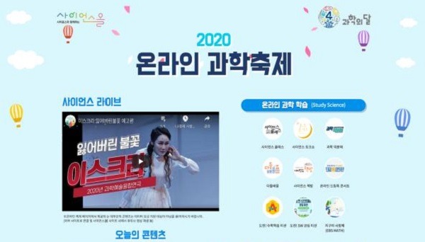 4월 과학의 달을 맞이하여 과학강연, 우수과학도서 강좌, 과학관 특별전 체험영상, 과학자 인터뷰, 과학연극·공연 등 다양한 과학문화콘텐츠를 제공코자 ‘온라인 과학축제’ 특별페이지를 운영 중이다.