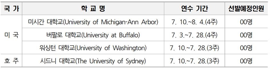 연수 기간은 7월부터 8월까지이며 미주와 오세아니아 지역의 해외대학 ▲미시간 대학교(University of Michigan-Ann Arbor/ 7월 10일~8월 4일, 4주) ▲버팔로대(University at Buffalo/ 7월 3~28일, 4주) ▲워싱턴대(University of Washington/ 7월 10~28일, 3주) ▲시드니대(The University of Sydney/ 7월 10~28일, 3주) 등 4개교다. 대학별 연수 프로그램에 따라 어학연수, 현지 문화 체험, 기업 현장 방문, 자기 주도 팀 프로젝트 등 다양한 활동이 진행된다.