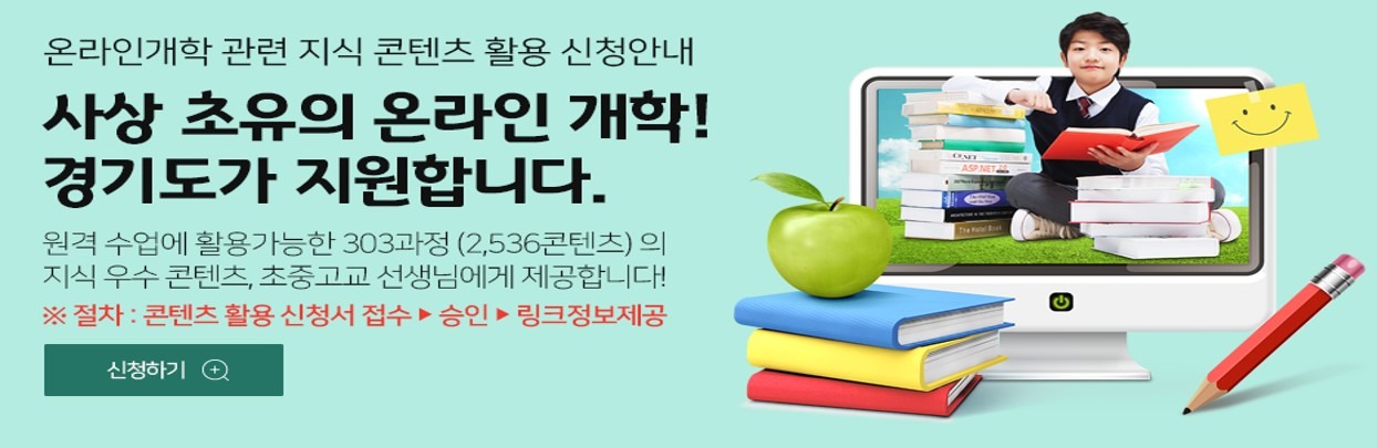 지역에 관계없이 교사라면 누구나 간단한 신청절차를 통해 이용 가능하며, 경기도 지식(www.gseek.kr) 사이트 내 ‘지식더하기 > 온라인개학 콘텐츠 신청’ 메뉴에서 교사가 직접 신청서를 작성하면 된다.
