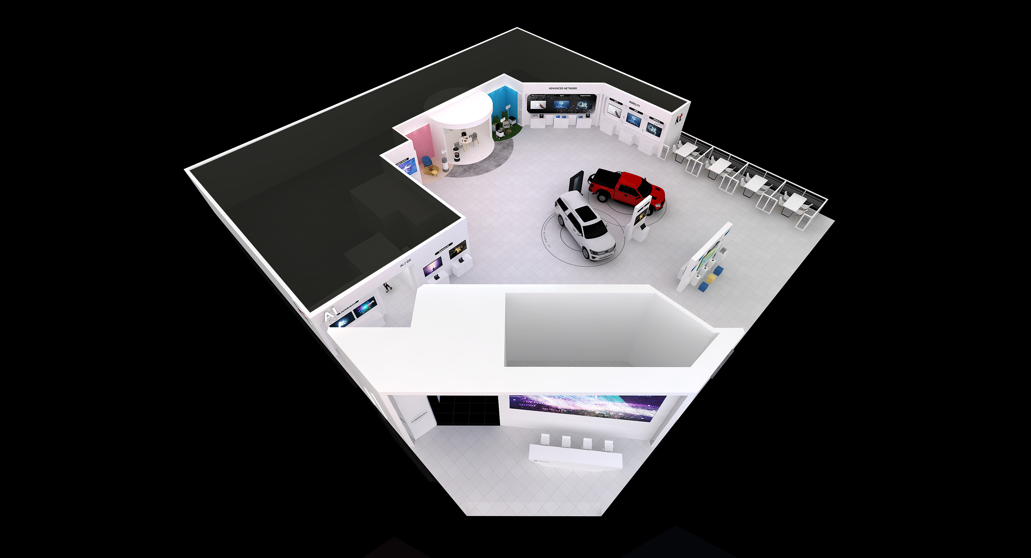 KT 전시 부스는 ▲AI ▲ROBOT ▲NETWORK 3가지 존으로 구성된다. 전시관 입구에서는 ‘대형 미디어 아트’가 먼저 안내한다. 대형 미디어 아트는 MWC 2023에서 글로벌 관람객들에게 많은 관심을 받았던 공간이다. 이 곳에서는 KT의 디지털 혁신 서비스를 시각적으로 느낄 수 있다.