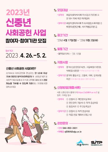 세종특별자치시가 (재)세종테크노파크 신중년센터와 신중년세대에게 사회공헌 기회를 제공하기 위해 오는 26일부터 내달 2일까지 '2023년 신중년 사회공헌 사업' 참여자와 참여기관을 모집한다.