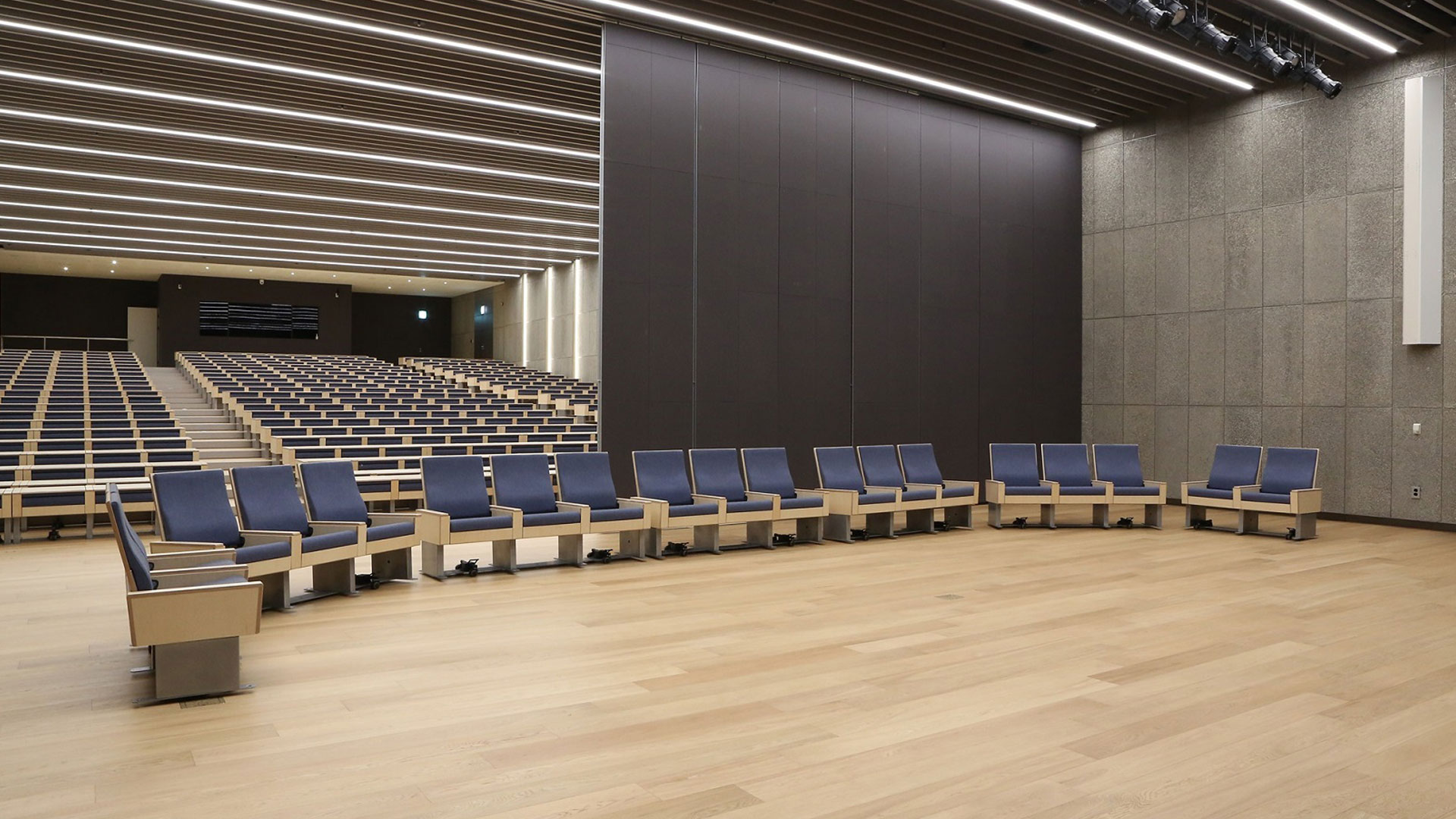 이 디자인에는 ‘공간의 유연성’을 높이기 위한 이동·접이식 좌석과 무빙월(Moving Walls)이 적용됐다. 상황에 맞게 좌석을 옮겨 배치할 수 있으며, 등받이 부분을 접어 벤치 또는 테이블 등의 용도로 활용할 수 있다. 측벽에 숨겨진 무빙월을 통해 대강당 공간을 두 개의 공간으로 분리해 사용할 수도 있다.