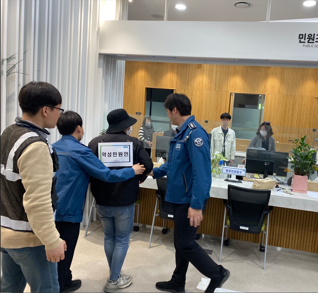 이날 모의훈련은 민원인이 상담 도중 공무원에게 폭언, 폭행과 함께 기물을 파손하는 상황을 가정하고 ▲민원인 진정 유도 ▲비상벨 작동(112 종합상황실 연결) 및 청원경찰 호출 ▲피해공무원 보호 ▲방문 민원인 대피 ▲가해 민원인 제압 ▲경찰 인계 등 매뉴얼에 따라 행동하는 순으로 진행됐다. 청원경찰과 관할 경찰서가 직접 출동해 현장감을 높였다.