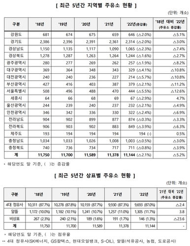 '22년 말 기준으로 전국에 영업 중인 주유소는 1만1천 144개소로 '21년 말 대비 2.1% 감소했다.
