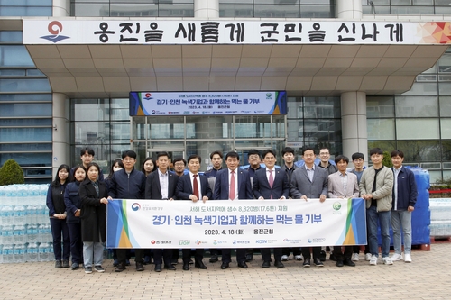 옹진군은 지난 18일, 옹진군청 파도광장에서 한강유역환경청, 경기·서울 녹색기업(8개소)과 함께 '먹는 물 기부' 릴레이에 동참해 2ℓ 생수 약 8천 병을 전달받았다고 밝혔다.