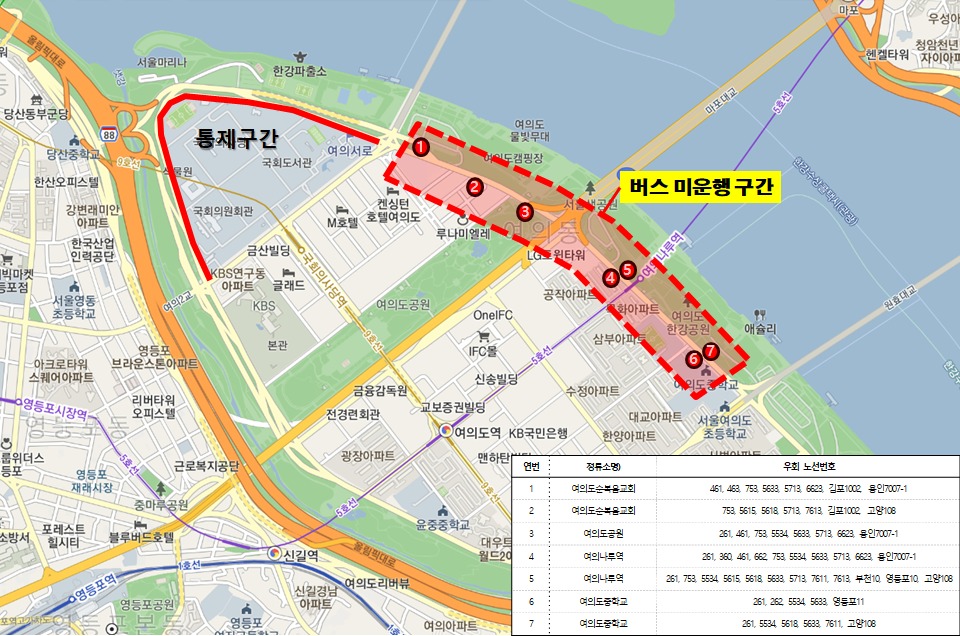 주말기간(4.11~4.12) 여의도 윤중로 인근 버스 정류소 7개소를 폐쇄하고, 해당 정류소에 정차하는 17개 노선을 우회 운행한다.