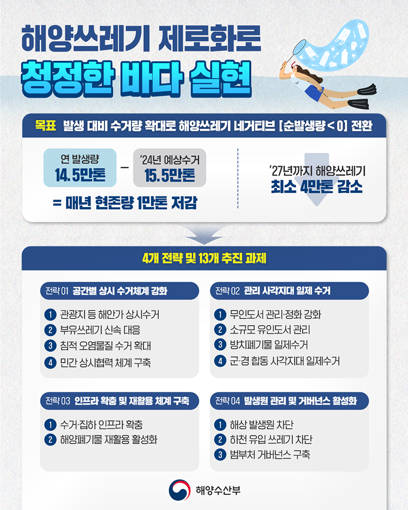 이에 해수부는 ‘해양쓰레기 수거를 넘어 쓰레기 영향 제로화 바다’라는 비전 아래 대규모 일제수거와 시설 확충 등을 통해 연간 해양쓰레기 유입량보다 수거량이 많아지는 ‘해양쓰레기 네거티브’ 달성을 이번 대책의 목표로 삼았다.