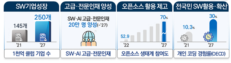 다양한 소프트웨어 캠페인 활동도 진행해 일상에서 소프트웨어를 친숙하게 접하도록 하고 이를 통해 개인의 코딩 경험률(경제협력개발기구 조사)이 2021년 10.3%에서 2027년 30%까지 높아질 수 있도록 지원한다.
