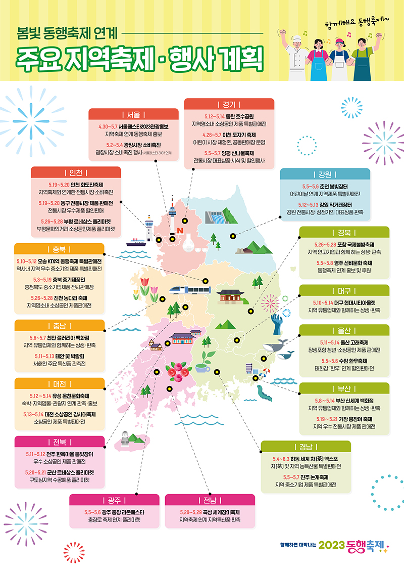 이를 위해 개막행사를 다음달 9일 대전에서 열고, 울산 ‘고래축제’, 하동 ‘세계 차 엑스포’, 충남 ‘태안 꽃 박람회’, 전주 ‘한옥마을 봄빛장터’ 등 30개 지역축제·행사와 연계해 동행축제를 팔도 동행축제로 전개할 계획이다.