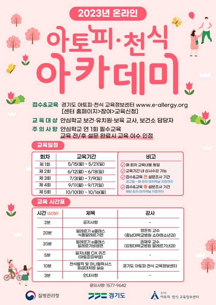해당 과정은 5월부터 연 5회 실시되며, 경기도 아토피·천식 교육 정보센터 누리집(www.e-allergy.org)을 통해 신청할 수 있다. 강의는 알레르기 전문의가 알려주는 식품알레르기와 알레르기비염 질환 정보, 천식 급성 악화와 아나필락시스 상황을 대비한 응급대처법 교육이 포함됐다.