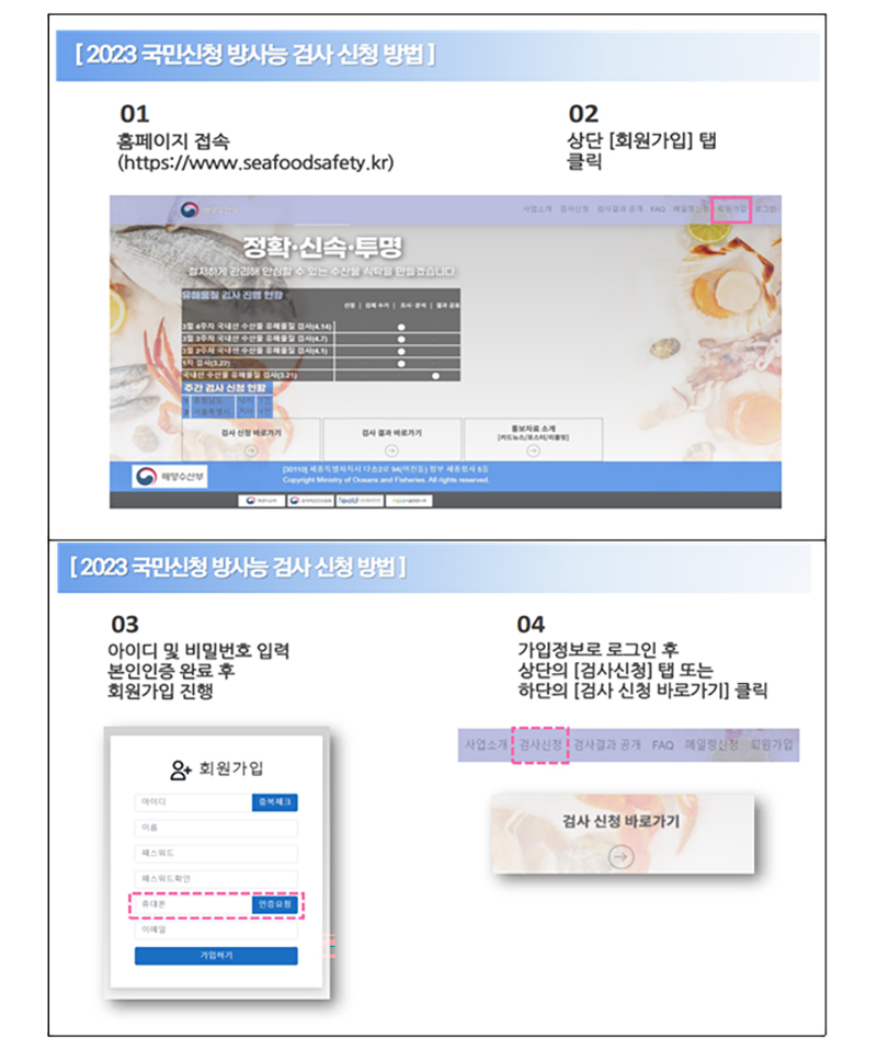 국민 누구나 방사능 검사 게시판( seafoodsafety.kr )에서 회원가입을 한 후 품목과 지역을 선택해 주 1회 신청할 수 있다. 신청현황은 투명하게 공개된다.