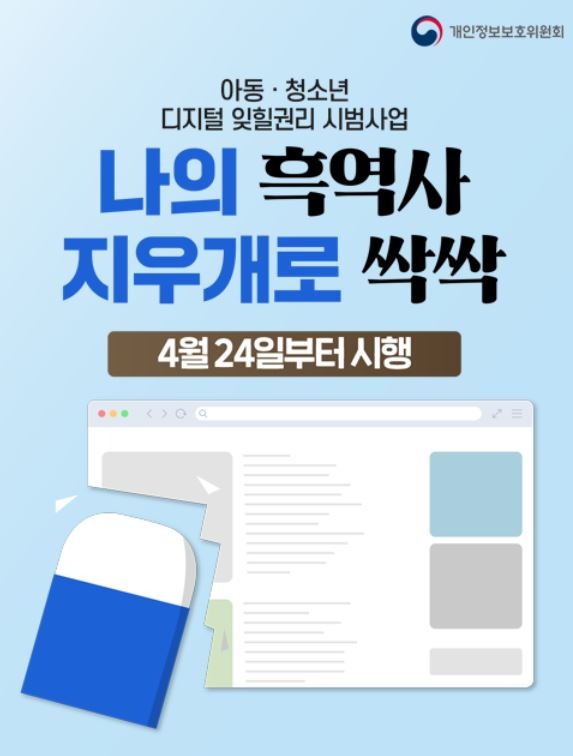 개인정보보호위원회는 24일부터 아동·청소년의 개인정보에 대한 통제권을 강화하기 위한 ‘아동·청소년 디지털 잊힐권리 시범사업’을 개시한다고 밝혔다.