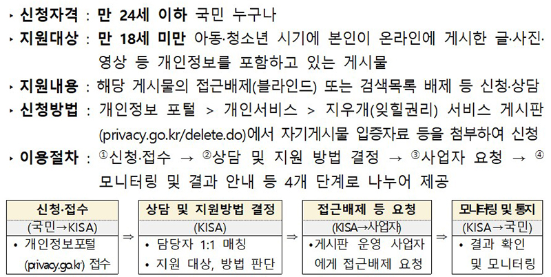 개인정보 포털 내 서비스 신청 페이지에서 만 18세 미만 아동·청소년 시기에 게시했으나 현재는 삭제를 희망하는 게시물의 주소(URL)와 자기게시물임을 입증할 수 있는 자료를 함께 첨부해 신청하면 된다.