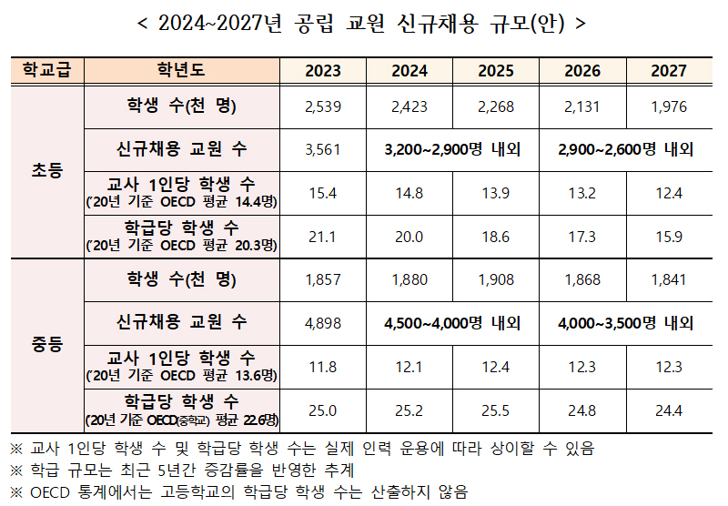 학령인구 감소 추세 및 새로운 교육 수요를 반영한 중장기 교원수급계획에 따라 교육부는 내년 교사 신규채용의 경우 초등 3200명 안팎, 중등 4500명 내외로 선발할 예정이다.
