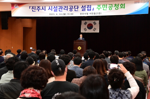경남 진주시는 지난 24일 오후 3시 시청 시민홀에서 시민, 민간전문가, 시의원, 공무원 등 200여 명이 참석한 가운데 진주시 시설관리공단 설립 주민공청회를 개최했다.