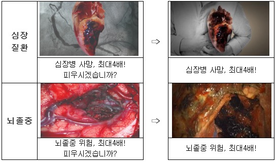 흡연의 위험성을 강조하고 질병 발생 또는 사망의 위험증가도를 수치로 제시하여 이해도를 높인 현행 주제 전달(메시지) 구성 방식을 유지하되,