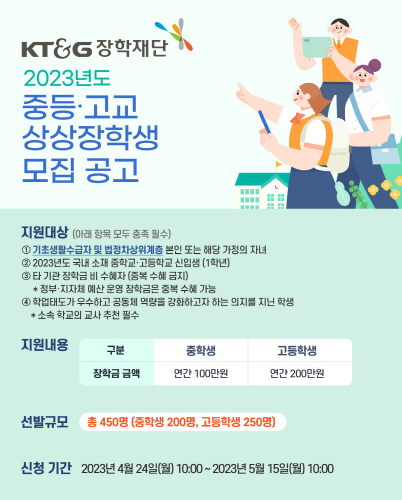 '2023년도 중·고교 상상장학생'은 국민기초생활 보장법에 따른 기초생활수급자와 차상위계층 중·고등학생이 대상이며 오는 5월 15일까지 KT&G장학재단 홈페이지를 통해 지원가능하다.