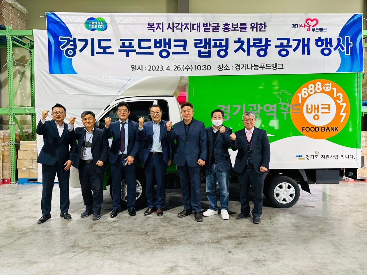 경기도는 26일 경기도사회복지협의회 및 경기도푸드뱅크연합회와 함께 경기광역푸드뱅크(화성시 정남면 소재)에서 복지사각지대 발굴 홍보를 위한 ‘푸드뱅크 랩핑 차량 공개행사’를 개최했다.