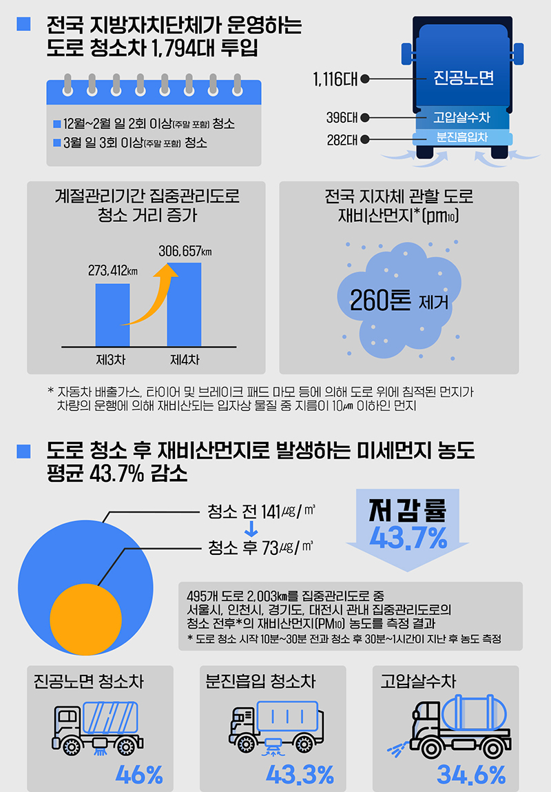 환경부와 지자체는 제4차 미세먼지 계절관리제 동안 전국 495개 도로를 집중관리도로로 선정한 뒤 4개월 동안 지난 제3차 계절관리제 보다 3만 3245㎞를 늘려 모두 30만 6657km를 청소했다.