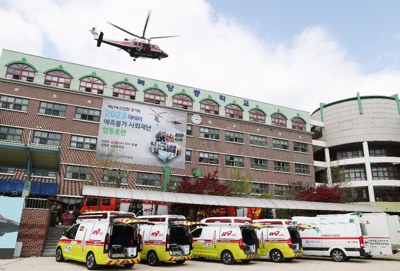 경기도는 26일 의정부 녹양중학교에서 이 같은 상황을 가정해 ‘2023년 대테러․예측 불가 사회재난 합동훈련’을 실시했다.