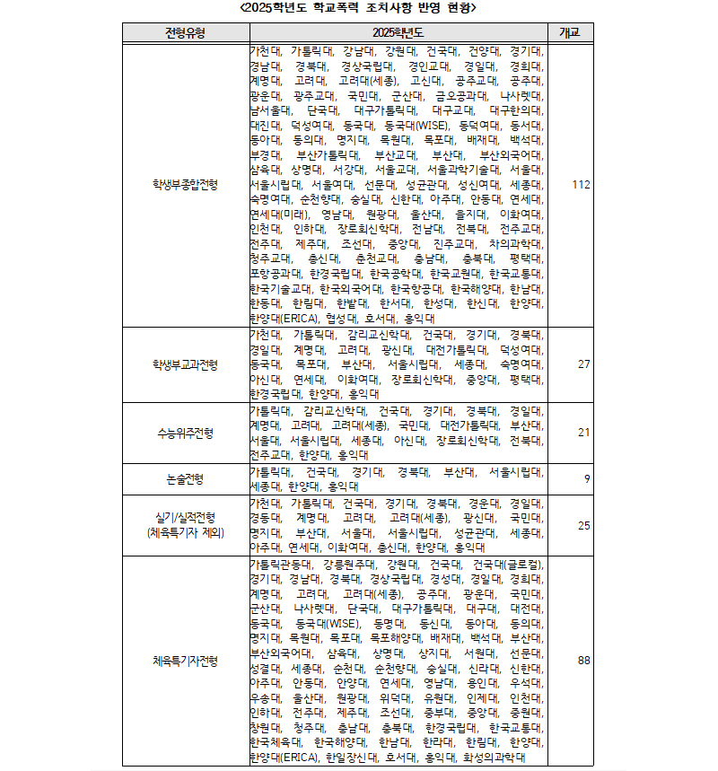 학생부종합전형 학폭 조치사항 반영 대학은 112개교, 학생부교과전형 학폭 조치사항 반영 대학은 27개교, 수능위주전형 학폭 조치사항 반영 대학은 21개교다.