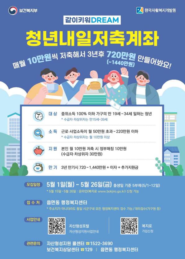 충청북도가 일하는 저소득 청년에게 안정적 경제 활동기반을 제공하고 든든한 사회생활을 지원하기 위해 5월 1일(월)부터 5월 26일(금)까지 ‘청년내일저축계좌’ 신규 가입자를 모집한다.
