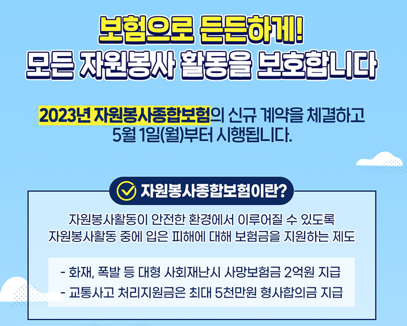 행정안전부는 사회재난 사망보험금과 교통사고 처리지원금 신설 등 보장을 다양화한 ‘2023년 자원봉사종합보험’의 신규 계약을 체결하고 5월 1일부터 시행한다고 밝혔다.