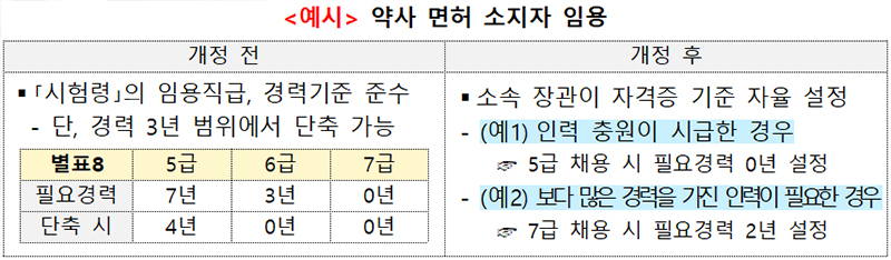 또 개정안은 부처 여건에 맞게 경력 인재를 채용할 수 있도록 자격증 소지자의 필요경력 기준을 자율적으로 조정할 수 있도록 했다.