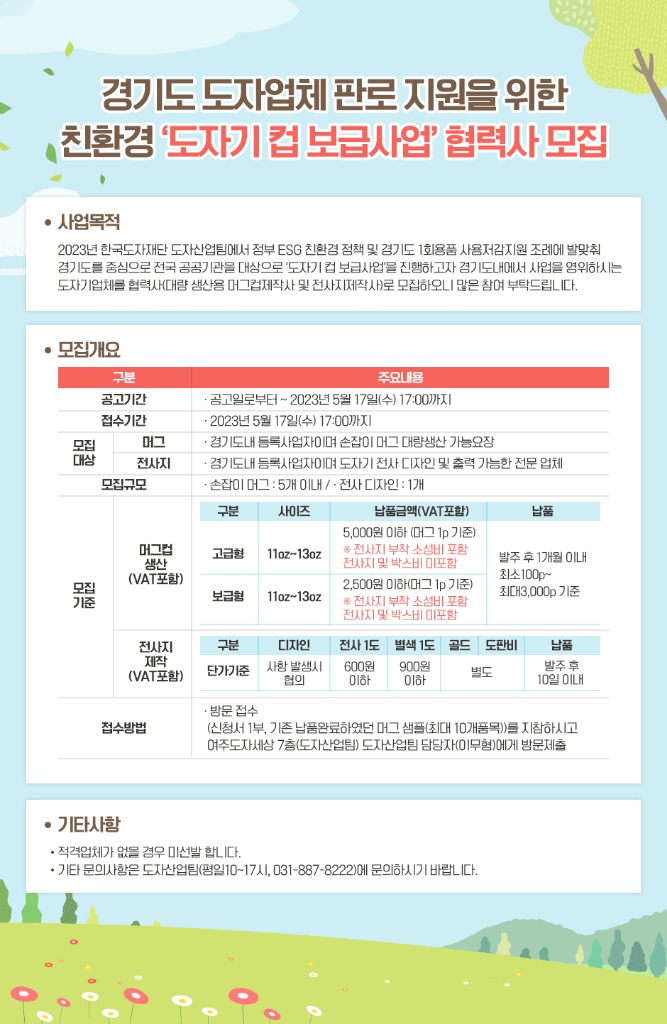 참가 자격은 경기도에 사업장을 둔 업체로, 머그컵 대량생산이 가능한 요장 5곳과 도자기 전사지 디자인 및 출력이 가능한 업체 1곳을 모집한다.