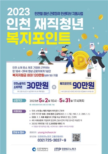 인천광역시는 인천 재직청년들의 삶의 질 향상 및 근속 유도를 위한 '인천 재직청년 복지포인트' 사업 참여자를 오는 5월 31일까지 선착순 모집한다고 밝혔다.